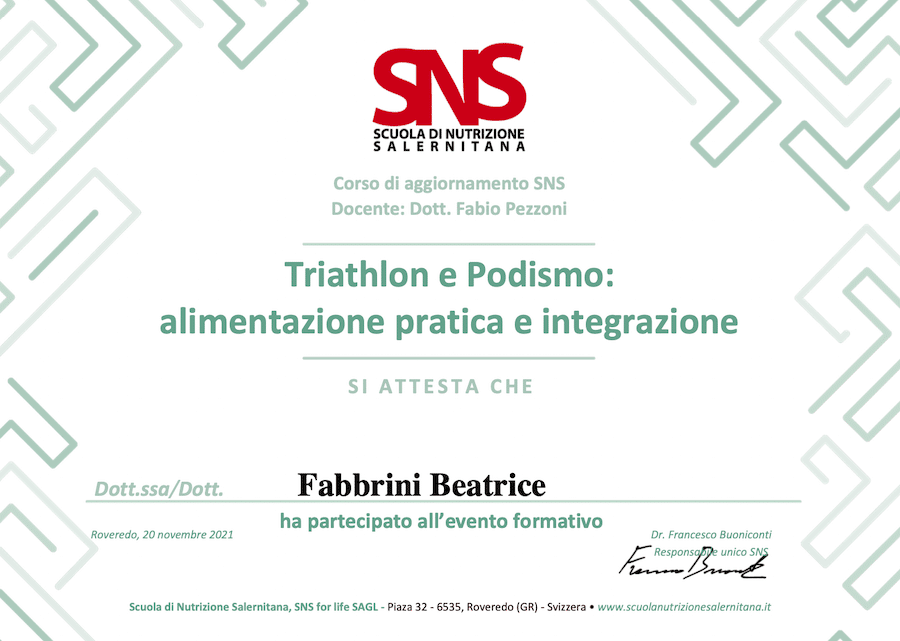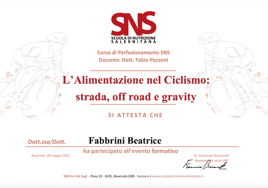 Ho proseguito poi la mia formazione con corsi di perfezionamento e aggiornamento professionale in vari ambiti specifici, tra cui la nutrizione pediatrica e l’alimentazione e l’integrazione nello sport.